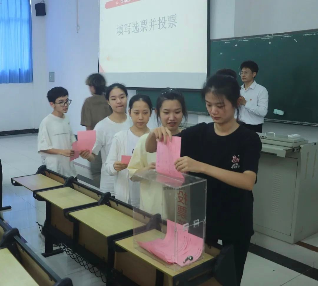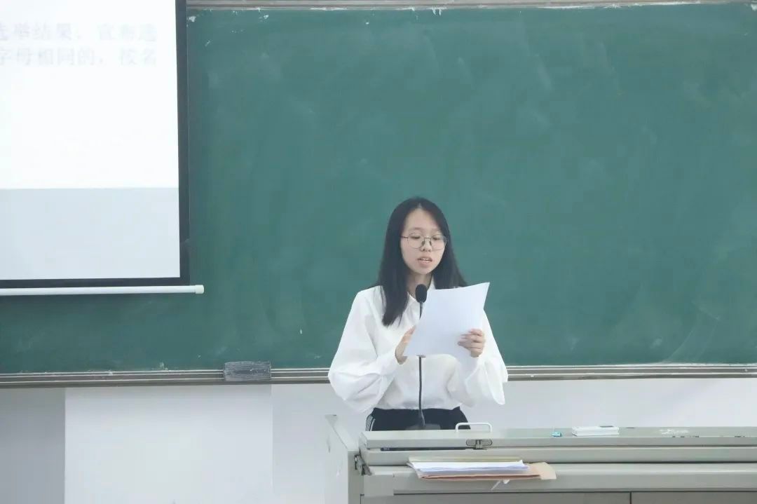 主持人宣读监票人、计票员、唱票员名单。总监票人伍朝辉说明了选票注意事项。工作人员分发选票。紧接着主持人王歆颖宣读“团学代会”委员候选人名单和简介。在介绍完六名候选人的情况(以姓氏笔画排序)后,秉承着公平公正的原则,各位学生代表填写选票并投票。最后由总监票人伍朝辉及相关工作人员计票。