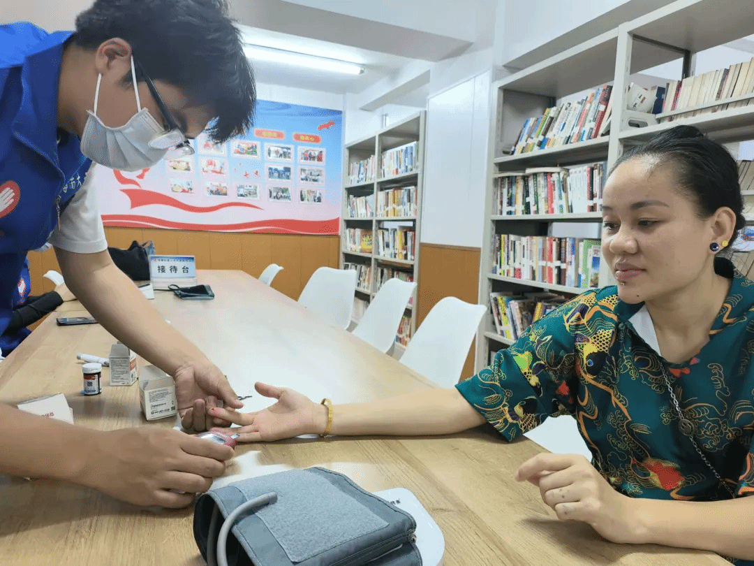活动中,志愿者们耐心地为社区居民们检测血糖血压,通过交谈深入了解他们的健康状况,并具体给予相关建议。