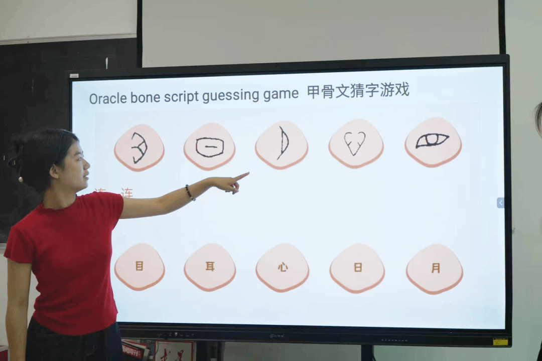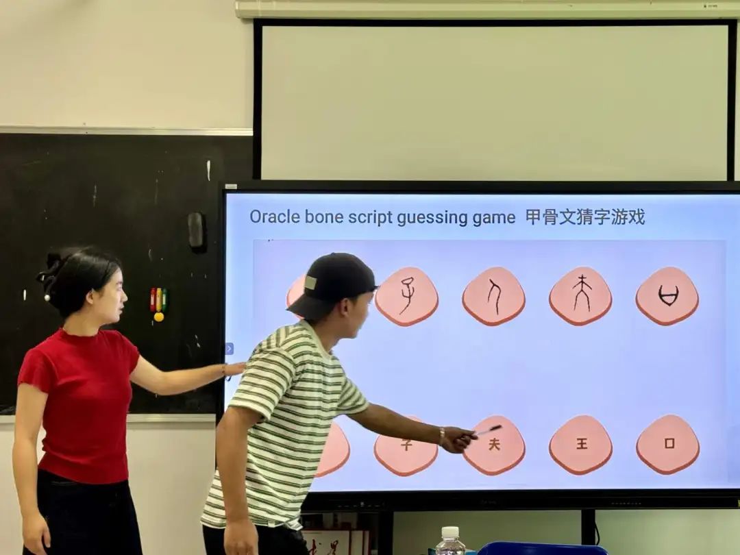 主持人为中外学生讲述了象形文字的演变,以"河"和"日"两个字为例,向同学们进行象形文字解读,生动形象地向大家展示了中国汉字的造字智慧。同时主持人邀请国际学生上台进行甲骨文和汉字的连线游戏,中外学生共同体验了汉字演变的历程。
