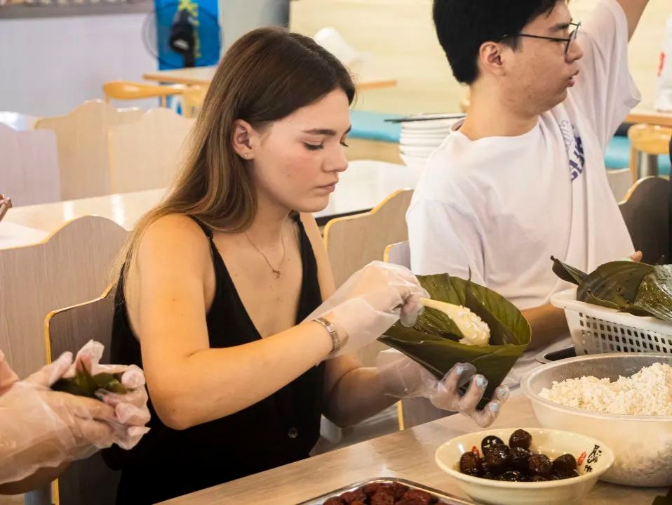 细看长桌上,糯米、猪肉、咸鸭蛋、葡萄干、蜜枣等材料早已备好。大家纷纷摩拳擦掌,迫不及待等待活动开始的讯号。这不,活动一开始,书院的中外学生马力全开,速速动手开始制作自己今年的第一个粽子。只见同学们手中粽叶翻飞,糯米和一应馅料被整齐地填补到凹好的绿色方寸之间,大家互相合作,老师在旁边耐心指导,气氛欢乐融洽。不一会,三角形、四角形、尖三角形、方形、长条形等各种形状的粽子便在盘子里堆成了“小山丘”。