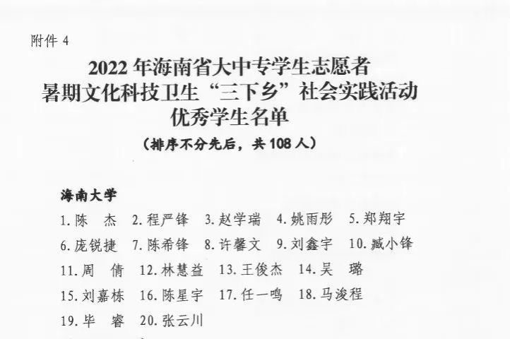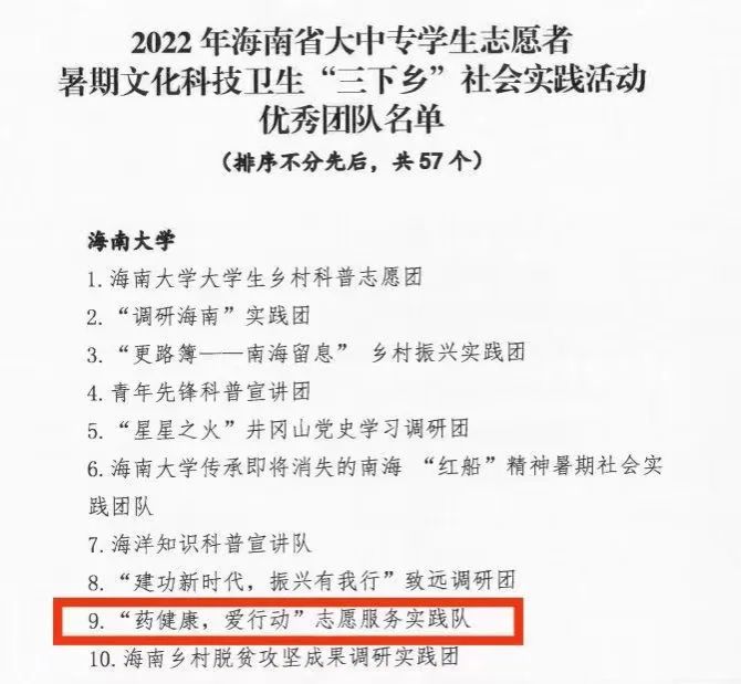 william威廉亚洲官方谢天宇老师、药学院黄玲副院长指导的“健康中国——药健康,爱行动”会实践获评2022年海南省大中专学生志愿者暑期文化科技卫生“三下乡”社会实践活动优秀团队荣誉称号,王俊杰同学获评海南省“三下乡”社会实践优秀学生荣誉称号。